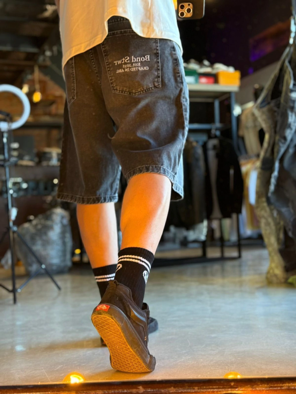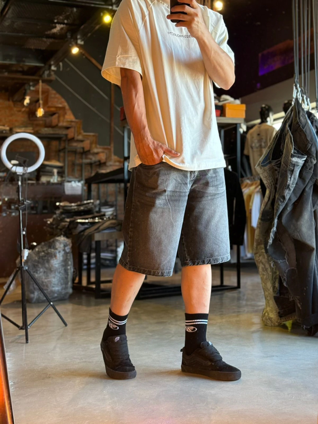 Bermuda de calce baggy, confeccionada en denim negro rígido con lavado intenso. Tiene un diseño hecho a láser en delantero, aportando un carácter moderno y distintivo. En el trasero, lleva bolsillos plaque con bordado institucional que refuerza identidad y estilo. Botón y remaches color negro, y badana institucional en combinación.
